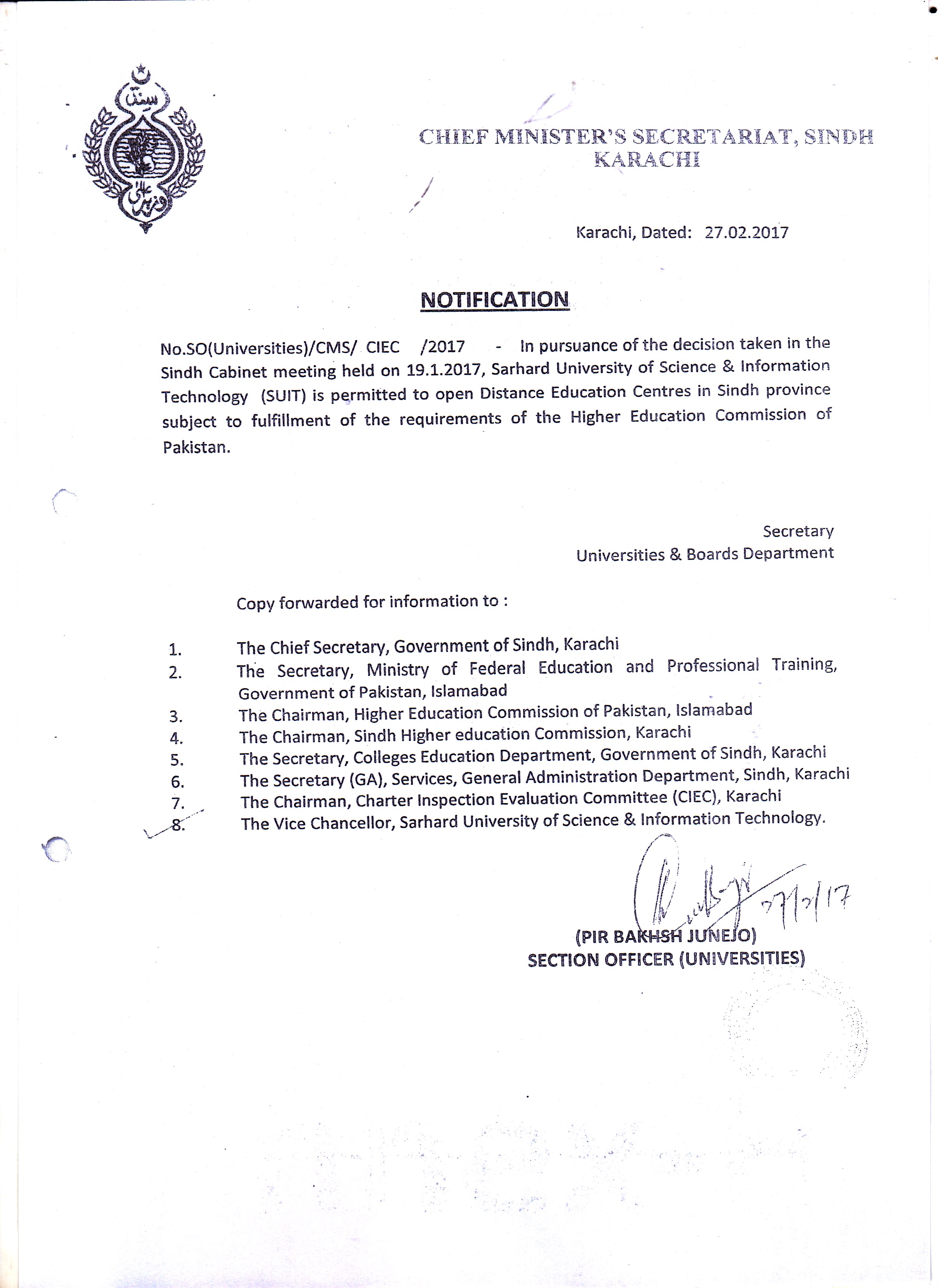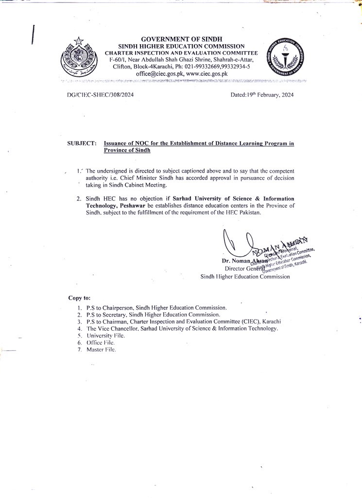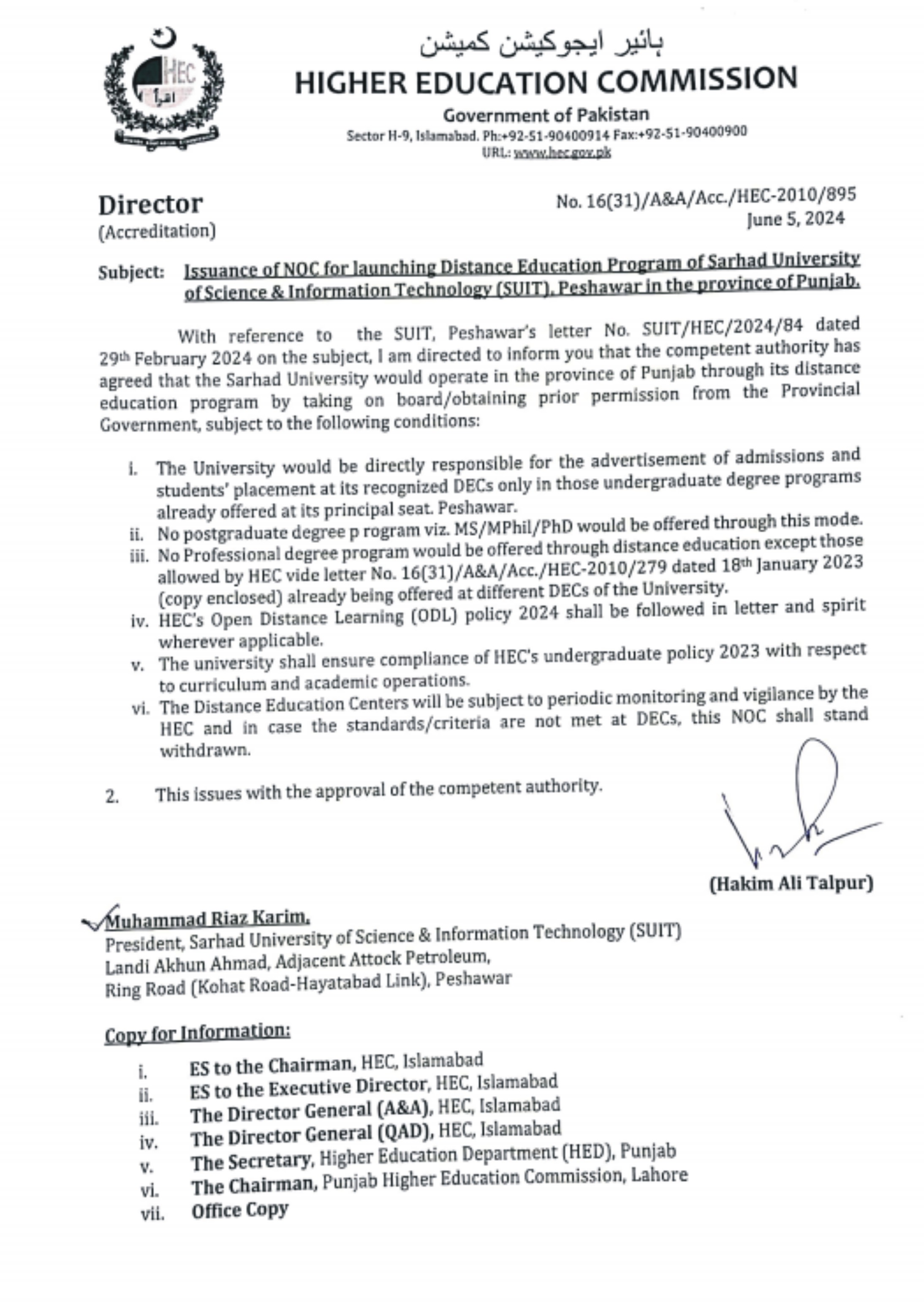 The province/region wise details regarding SUIT's legal status to offer Distance Learning Programs is as under and available at: https://www.suit.edu.pk/#/Distance-Education