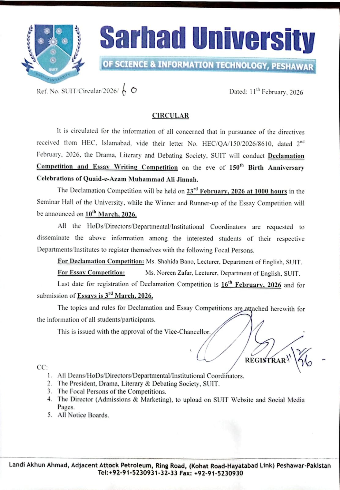 Declamation Competition and Easy Writing Competition on the eve of 150th Birth Anniversary Celebrations of Quaid-e-Azam Muhammad Ali Jinnah.