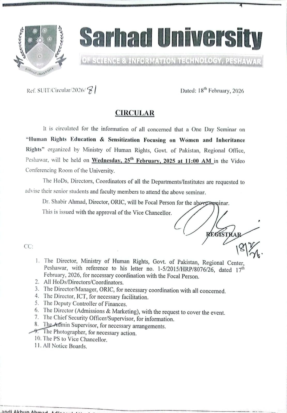 Circular - One Day Seminar on Human Rights Education & Sensitization Focusing on Wand Inheritance Rights / Wednesday, 25th February, 2025 at 11:00 AM in VCR